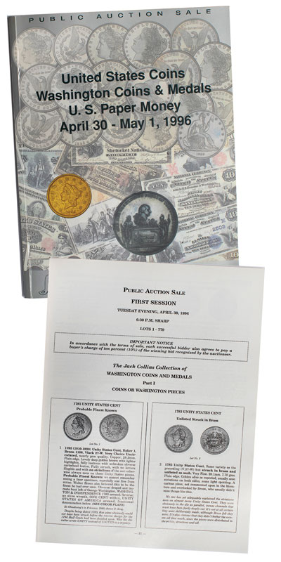 As one example from my research, I discovered Jack Collins, George’s partner in founding the Numismatic Bibliomania Society, put his Washingtonia collection up for auction in 1996 with Stack’s, then based in New York.